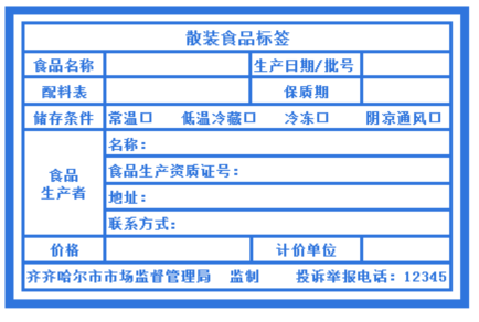 | 标 题: | 齐齐哈尔市市场监督管理局关于印发《齐齐哈尔市散装食品经营管理规范》的通知 | ||